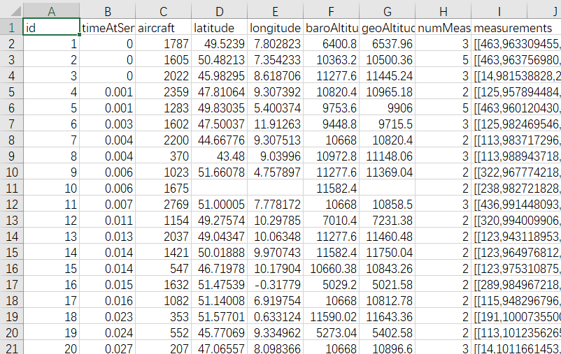 Firstly, we can examine the structure of the dataset, which is as follows. It comprises the following fields: id, timeAtServer, aircraft, latitude, longitude, baroAltitude, geoAltitude, numMeasurements, and measurements. Here's a detailed explanation of each data field: