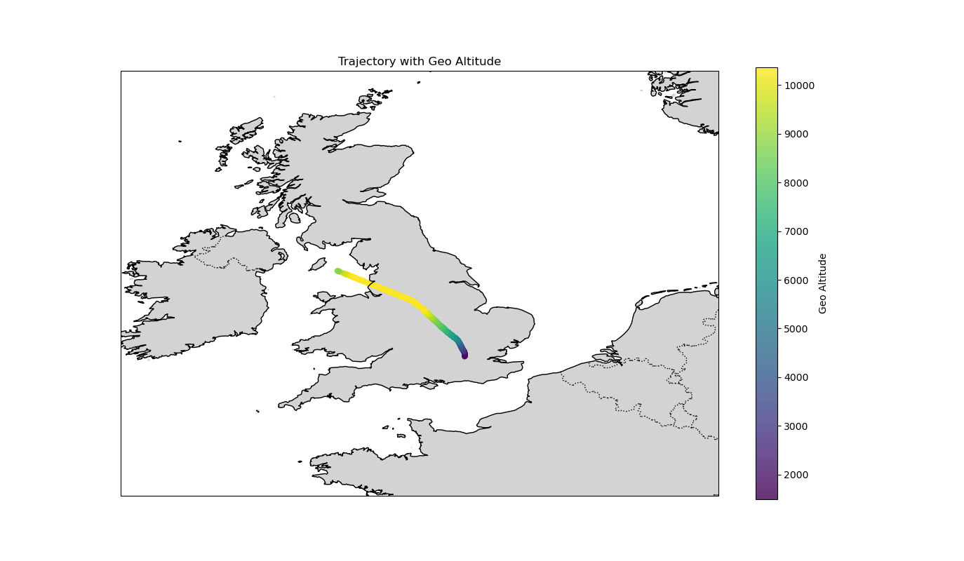 After completing the dataset, we can now analyze the trajectory of a particular aircraft. Below is the trajectory of aircraft 106, where it is evident that this aircraft is flying from London to Belfast.